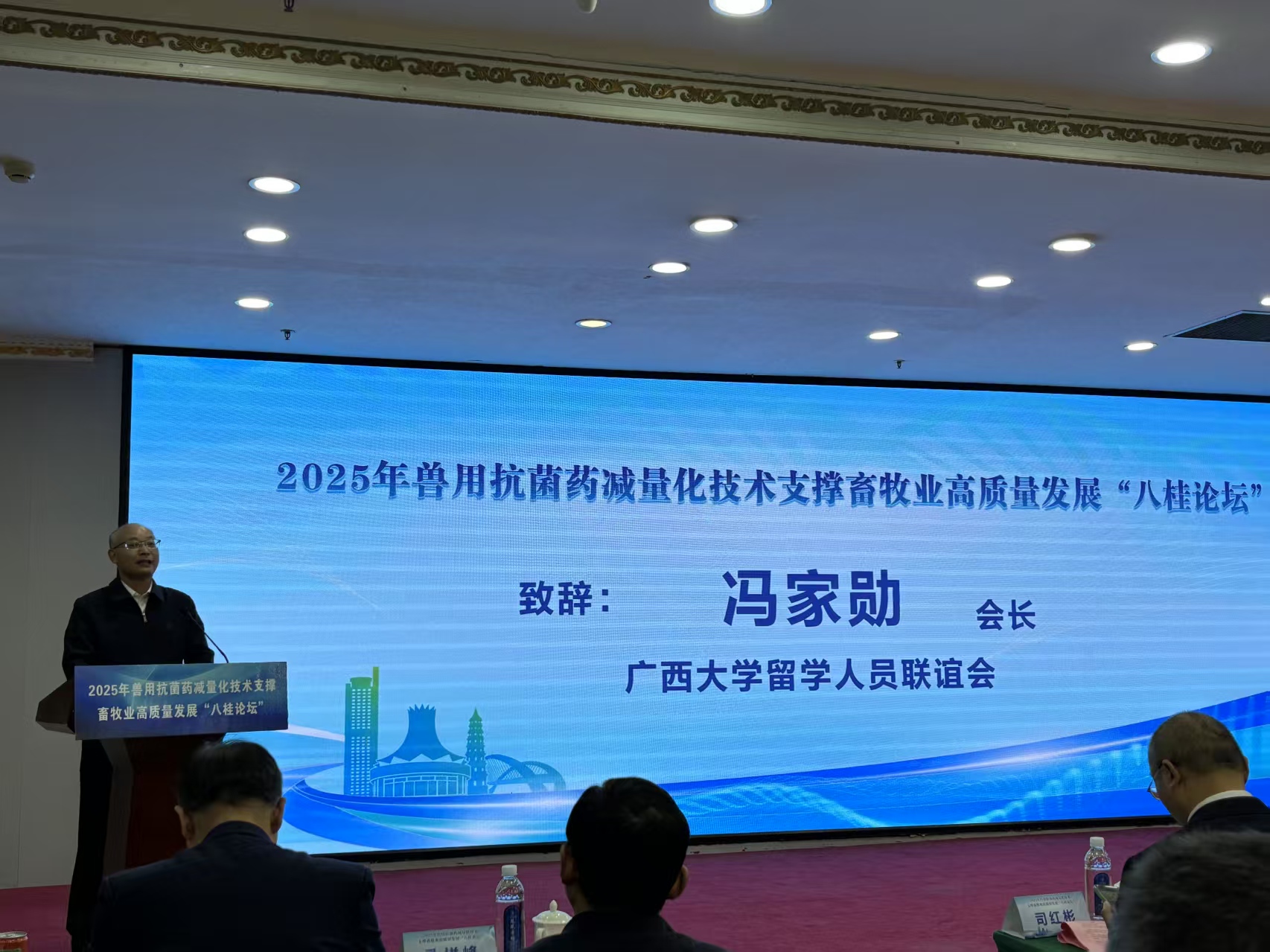 11月22-23日,由广西畜牧兽医学会中兽医与兽药学分会、广西动物保健品协会、广西大学留学人员联谊会(简称“校留联会”)等机构联合主办的2025兽用抗菌药减量化技术支撑畜牧业高质量发展“八桂论坛”在南宁盛大开幕。论坛由校留联会副会长、农牧发展研究院院长司红彬主持。广西大学原副校长(生物学专家)、广西欧美同学会副会长、留联会会长冯家勋教授出席开幕式并致辞。
