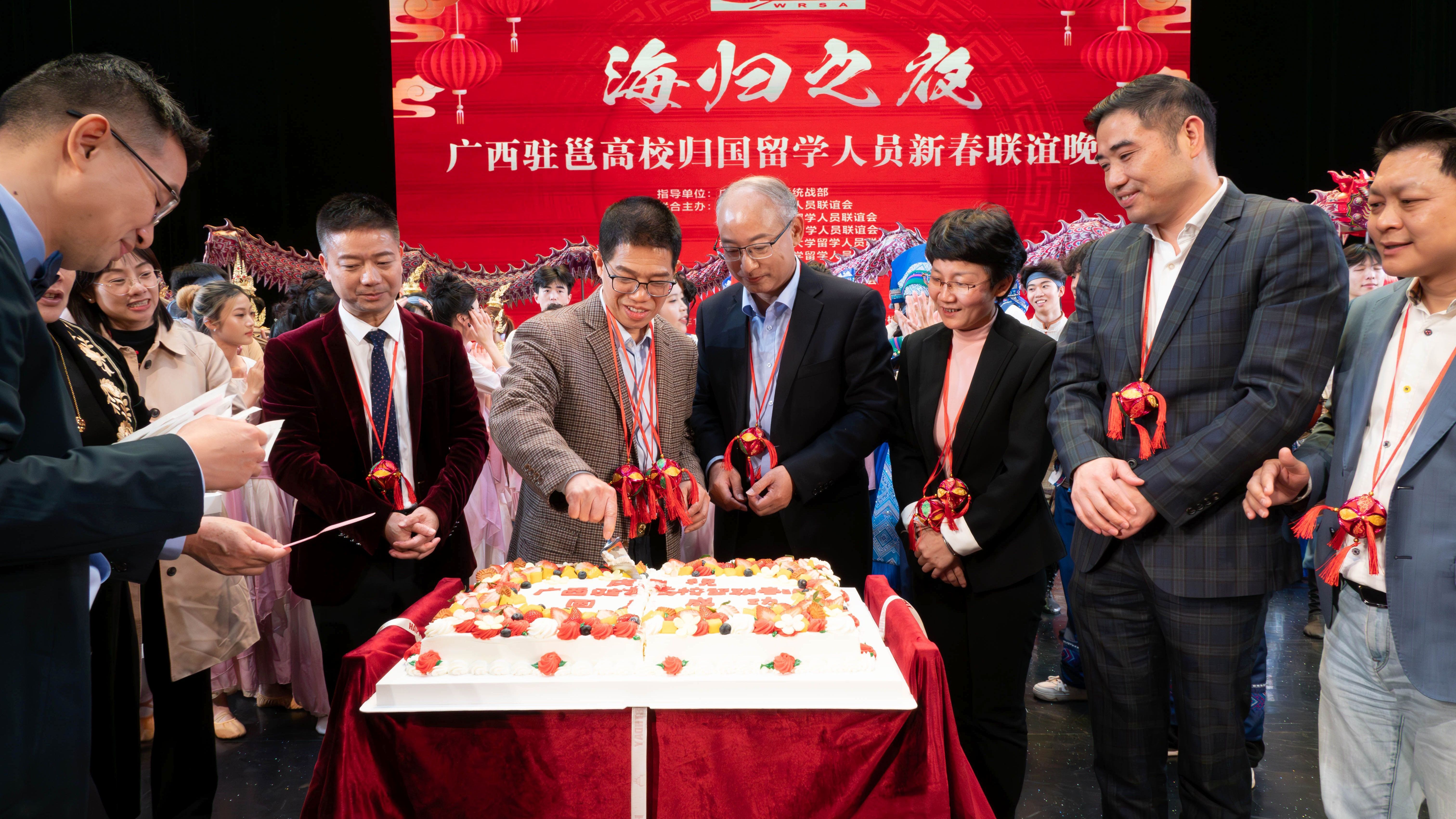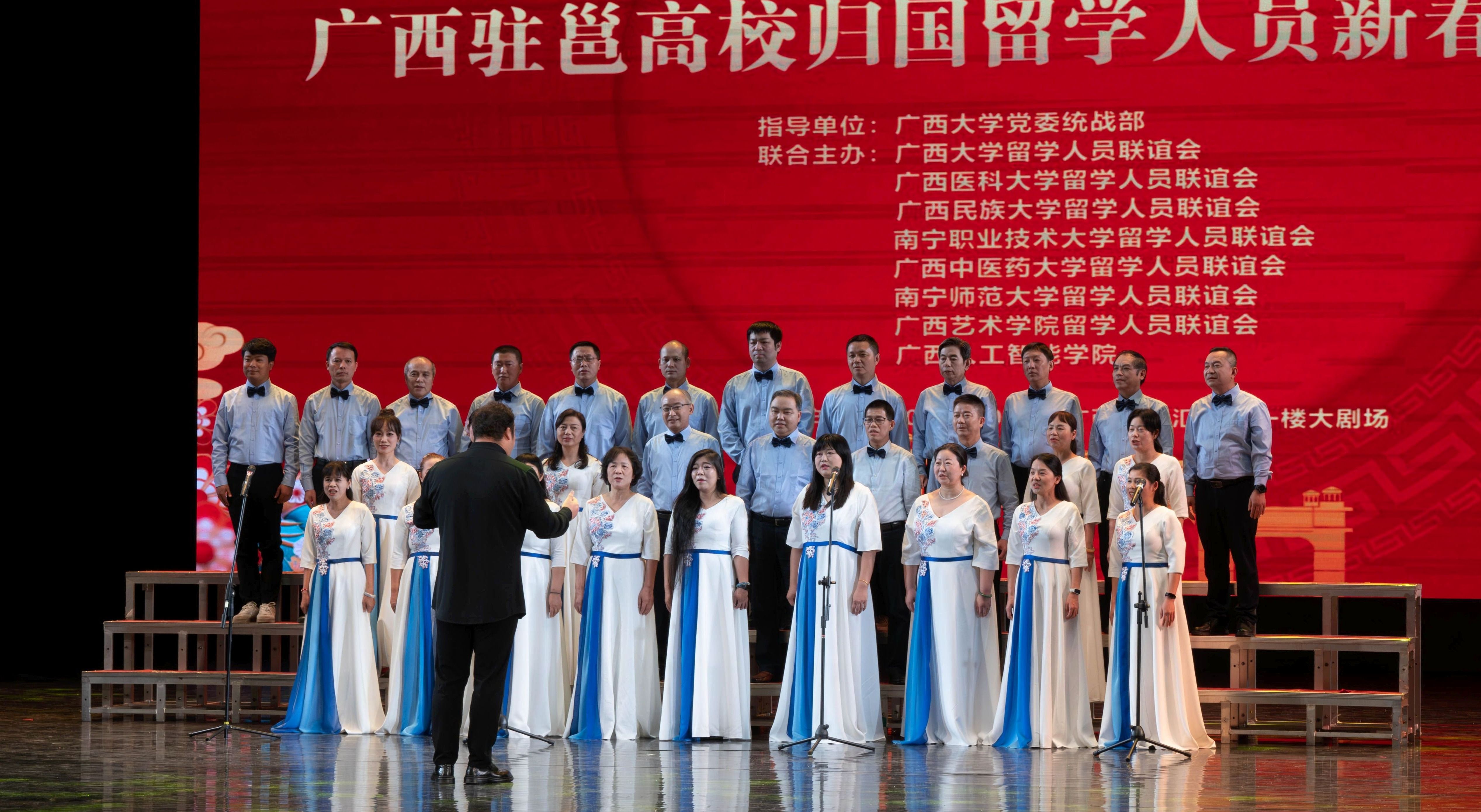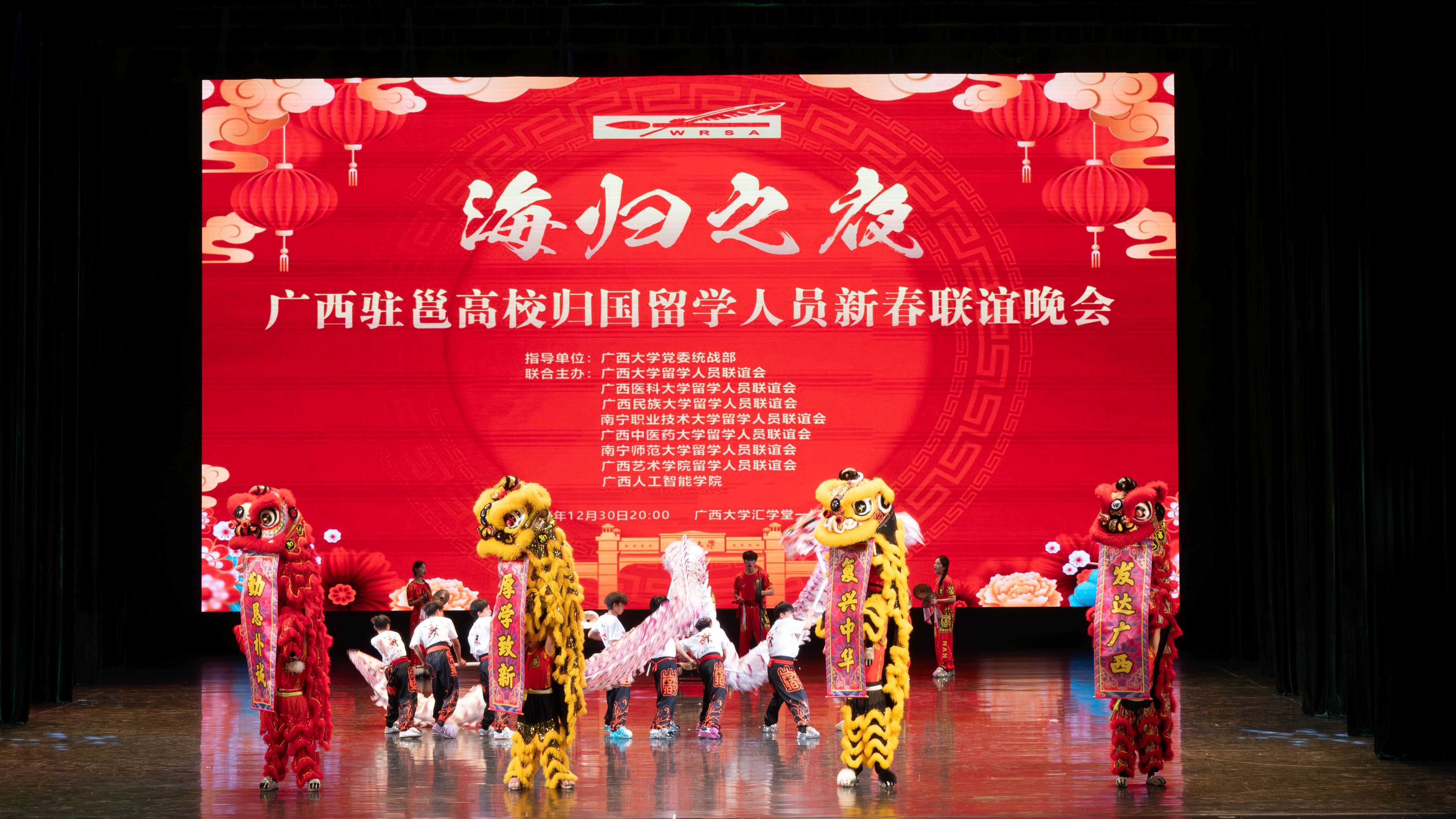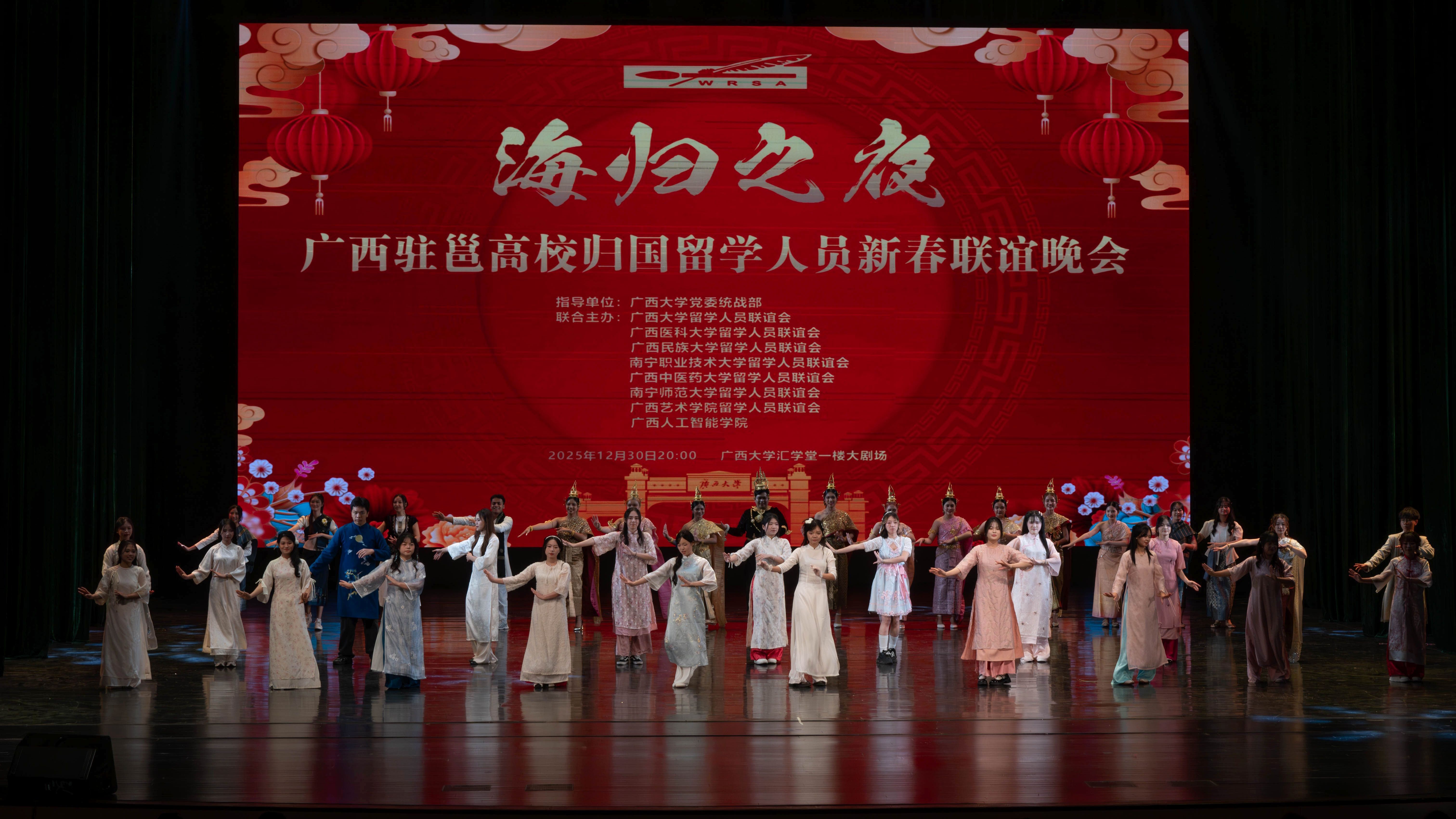 12月30日,由广西大学党委统战部指导,广西大学留学人员联谊会、广西医科大学留学人员联谊会、广西民族大学留学人员联谊会、南宁职业技术大学留学人员联谊会、广西中医药大学留学人员联谊会、南宁师范大学留学人员联谊会、广西艺术学院留学人员联谊会、广西人工智能学院联合主办的广西驻邕高校归国留学人员新春联谊晚会在广西大学汇学堂举行。自治区民宗委副主任邓娟娟出席晚会。广西大学党委副书记、校长肖建庄,南宁职业技术大学党委书记蹇兴超,广西大学党委副书记宁旭初、留学人员联谊会会长冯家勋等出席晚会并登台表演节目。