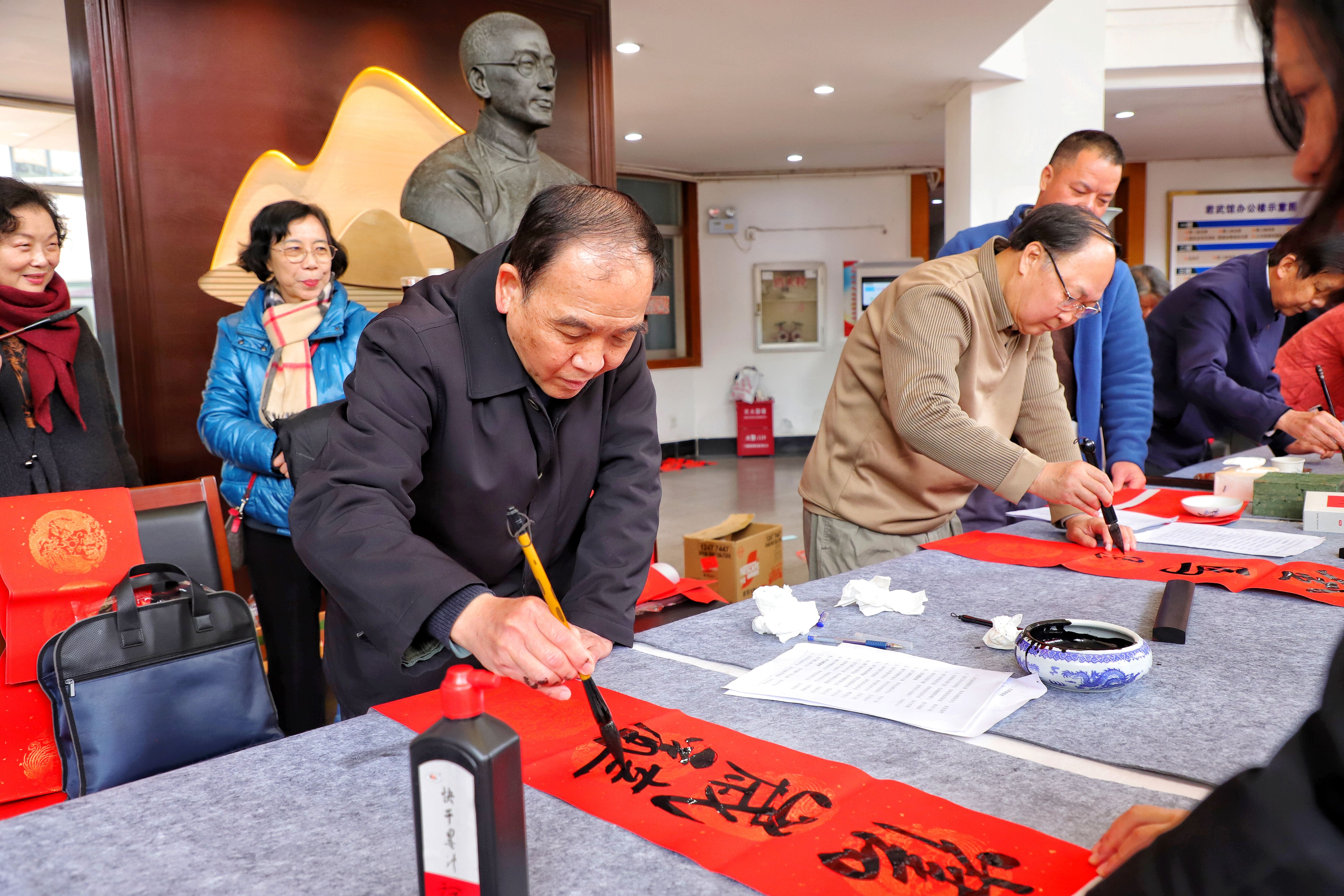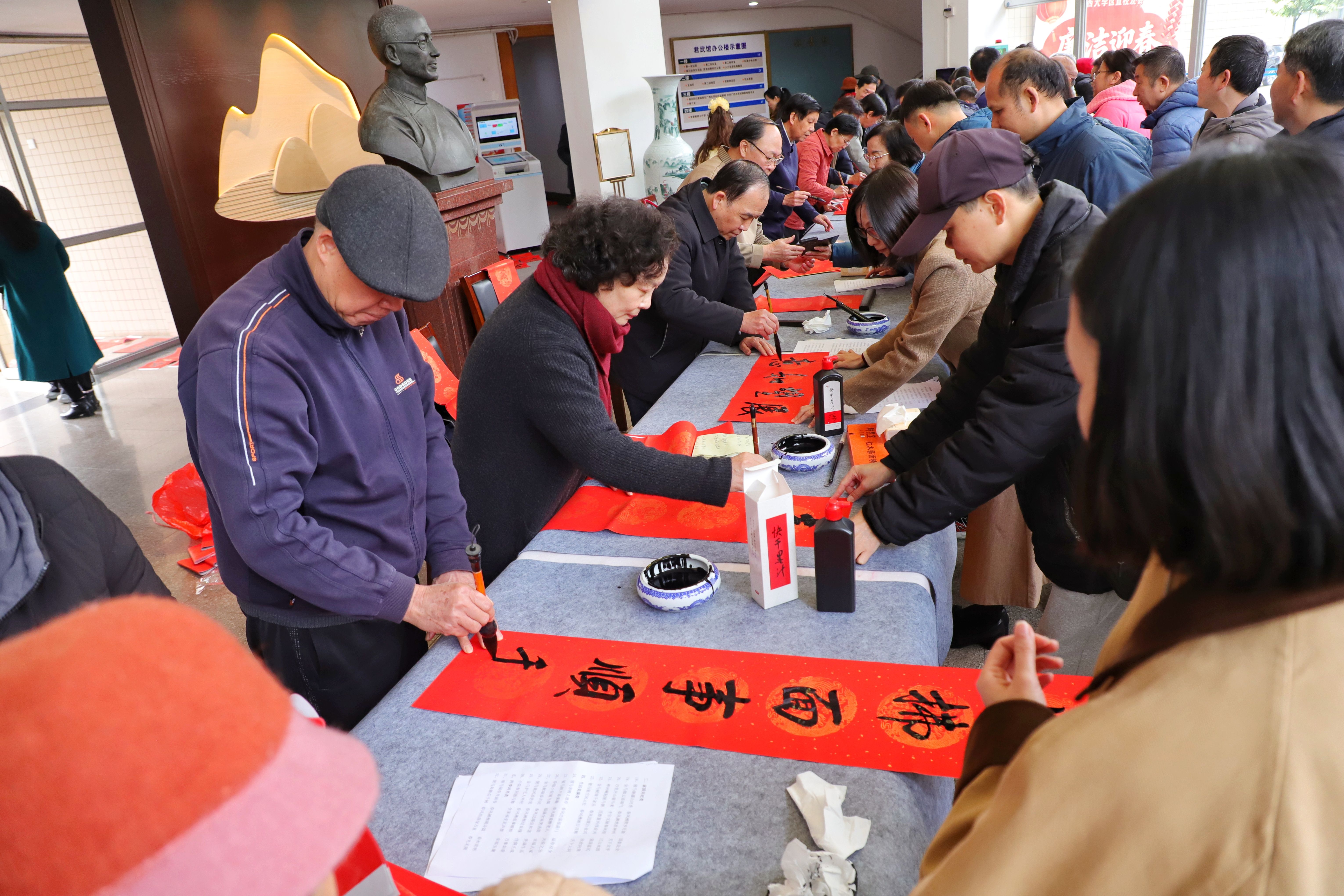 自治区高院原院长罗殿龙、自治区政协原副主席苏道俨、自治区科协原党组书记甘向群、高校工委原副书记秦敬德、自治区区直工委副书记邓金玉、自治区应急厅一巡李明凤、广西日报原副总编梁锡训、广西书法家协会副会长李翔峰,广西大学艺术学院原院长帅民风、教授张明学、教授翟旭民等老领导、老教师现场挥毫泼墨书写春联和“福”字各300余幅,为广大师生员工送上浓浓的新春祝福。